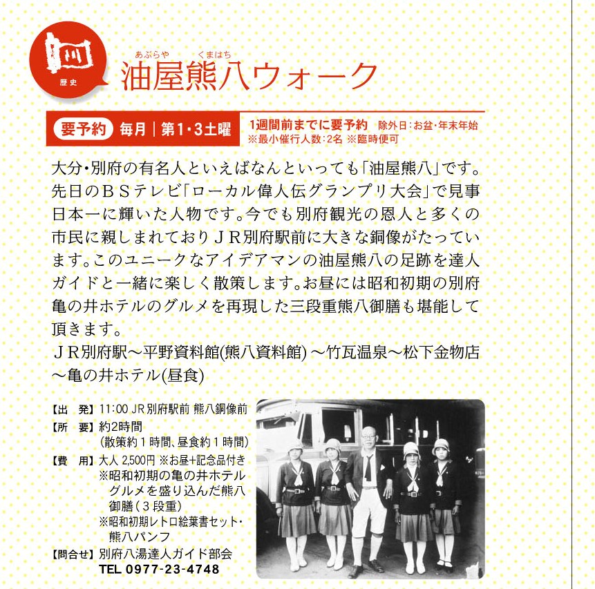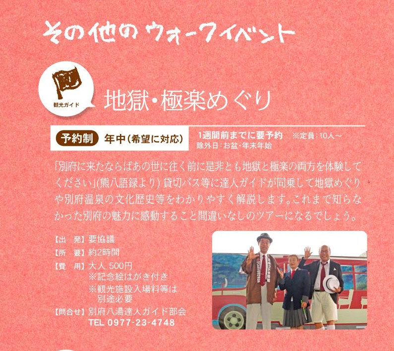 いよいよ別府八湯ウォークで新しいまち歩きが11月からスタートします。達人ガイドのみなさんが案内する「熊八ウォーク」、「地獄・極楽めぐり」の2コースです。みなさん是非ご参加ください。